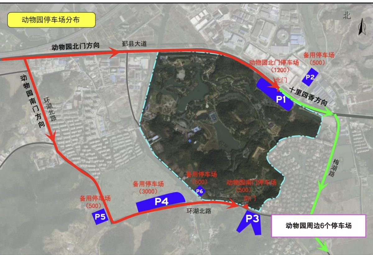 1.停車場分布。動物園周邊共6個停車場,備用停車場P5視情況開放。