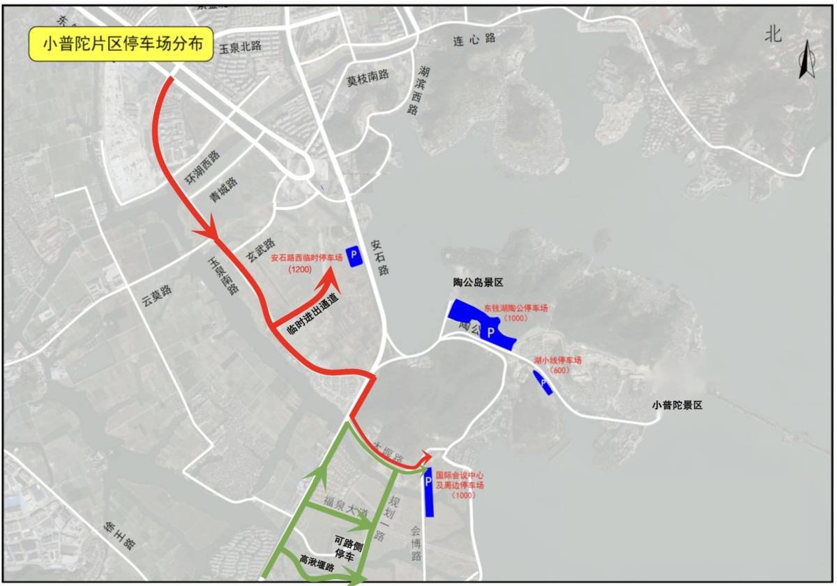 (1)玉泉南路往小普陀景區(qū)方向的自駕游車輛,提前自玉泉南路臨時通道至安石路西臨時停車場,步行至集散中心乘坐公交,或由興凱路、大堰路進入國際會議中心及周邊停車場,此處設(shè)置多個接駁點位(詳見圖小普陀免費接駁線路)。