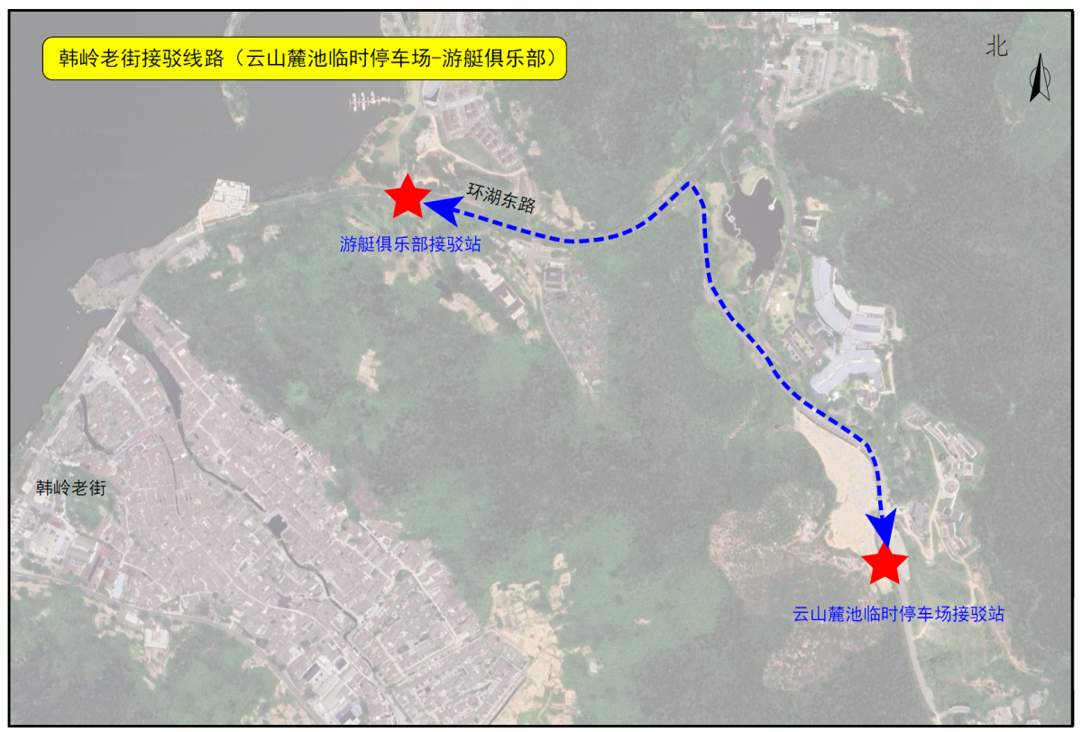 3.臨時交通管控。韓嶺老街停車場、云山麓池臨時停車場基本飽和時,將在環(huán)湖東路與環(huán)湖南路路口設(shè)置臨時交通管控點,啟動交通截流和引導(dǎo)措施。自駕游車輛可選擇環(huán)湖南岸線公共停車場、韓嶺小學(xué)公共停車場。