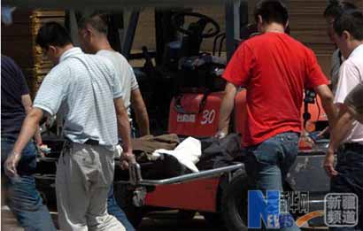 烏魯木齊市華凌市場(chǎng)內(nèi),警察將被害工人的遺體抬走。