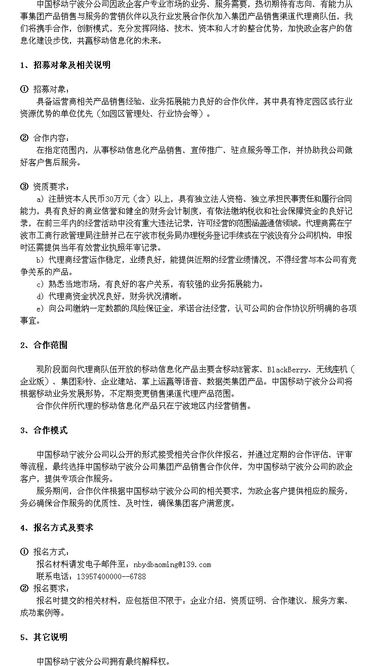 關于中國移動寧波分公司集團產品(銷售)合作伙伴招募公告
