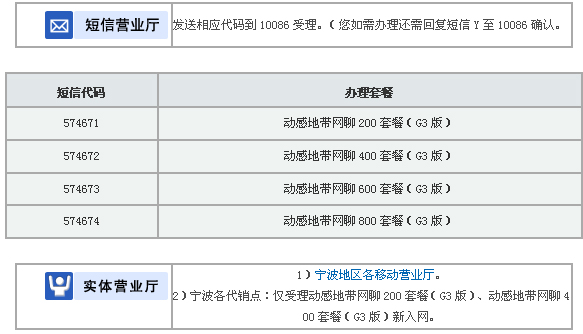 注:動(dòng)感地帶網(wǎng)聊200套餐(G3版)不能通過E通道方式改為動(dòng)感地帶網(wǎng)聊其他套餐,您可至營(yíng)業(yè)廳辦理。