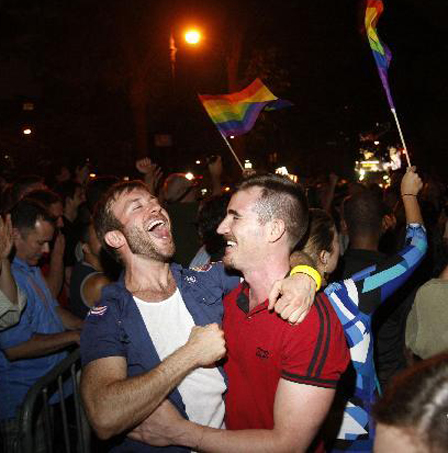 6月24日,在美國紐約,人們慶祝該州參議院投票通過同性婚姻法案。當天,紐約州參議院以33票贊成、29票反對的投票結果通過了該法案。此前,美國同性婚姻合法的地區(qū)還有:康涅狄格州、馬薩諸塞州、新罕布什爾州、佛蒙特州、愛荷華州和華盛頓特區(qū)。