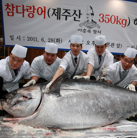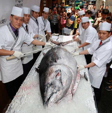 6月28日,一條打撈自濟(jì)州附近海域的巨型金槍魚(yú)被運(yùn)送到首爾,成為飯店一景。這條金槍魚(yú)重達(dá)350公斤,長(zhǎng)達(dá)2.7米。新華社發(fā)(樸真熙攝)