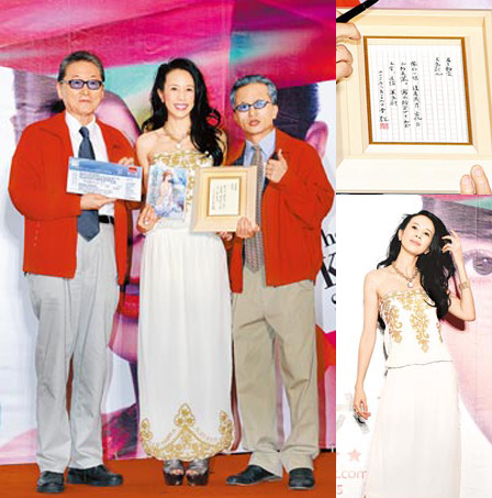 莫文蔚29日赴臺(tái)為七夕情人節(jié)個(gè)唱宣傳,李敖(左起)破例為歌手站臺(tái),以“人類最后一代文人寫的毛筆字”寫下“君子豹變,其文蔚也”,解釋“文蔚”二字原自易經(jīng)64卦,“像豹一樣,隨著歲月,變化自己的美麗”。