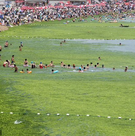 7月15日,青島市區(qū)最大的海水浴場遭到滸苔的兇猛圍攻,市民不得不在滸苔中與水嬉戲。據(jù)了解,一浴滸苔的厚度達(dá)到了50厘米,遠(yuǎn)遠(yuǎn)望去,海面如同一片草原。