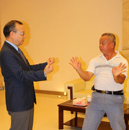 在比賽場館,場中的運動員在賽場上相互競技,場下的貴賓休息室,來自白鶴拳故鄉(xiāng)永春的永春拳協(xié)會常務副秘書長曾顯權(quán)與亞洲空手道聯(lián)盟秘書長、國際剛?cè)崃骺帐值勒齽傪^聯(lián)盟副會長莫國城交流了起來,兩人雖已年過六旬,但交流起白鶴拳與空手道的“剛?cè)帷痹E竅時卻是相談甚歡。莫國城表示,空手道的要領(lǐng)及一些套路拳法與白鶴拳相當一致,能有機會到此交流非常的高興,空手道本來就是中國功夫,只是現(xiàn)在的空手道將原來的功夫制度化,成為一種體育運動,但其本質(zhì)還是一致的。