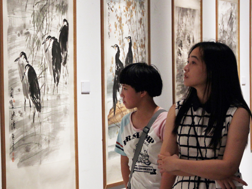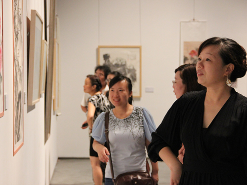 文衛(wèi)系統(tǒng)職工觀看書畫作品。