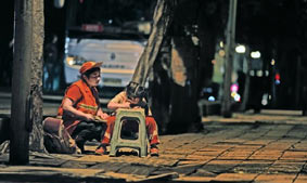 單親環(huán)衛(wèi)媽媽路燈下輔導女兒