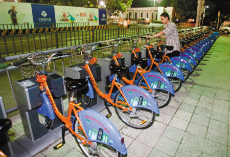 昨晚,在海曙區(qū)縣前街網(wǎng)點,剛剛安裝到位的公共自行車吸引行人駐足