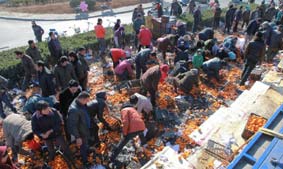 河北唐山貨車側(cè)翻35噸鮮桔遭哄搶