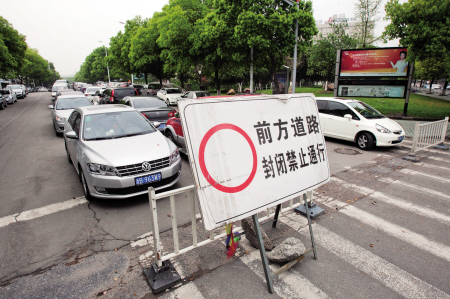 從南站西路進(jìn)入該路段時(shí),一塊寫有“前方道路封閉禁止通行”的標(biāo)識(shí)牌立在路口,但仍有不少車輛直接駛?cè)搿?/p>
