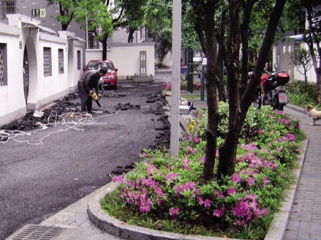 記者發(fā)現(xiàn)小區(qū)里瀝青路面起砂、坑洼現(xiàn)象很是普遍。施工人員告訴記者,他們從上星期剛開始道路修補(bǔ)施工,下一步會對刨開的地方重新鋪設(shè)瀝青。