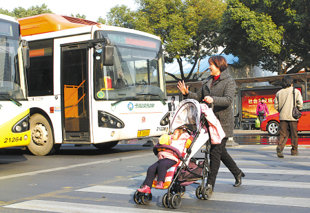 昨日,在百丈路七塔寺路口過斑馬線的一名行人向公交車司機(jī)致意。市公交總公司開展“公交車文明禮讓斑馬線”活動已有4年,贏得社會贊譽。目前該公司正在推出首創(chuàng)的“5321”工作法,即距路口約50米、30米、20米、10米,均要采取不同的減速措施,直至停車讓行。