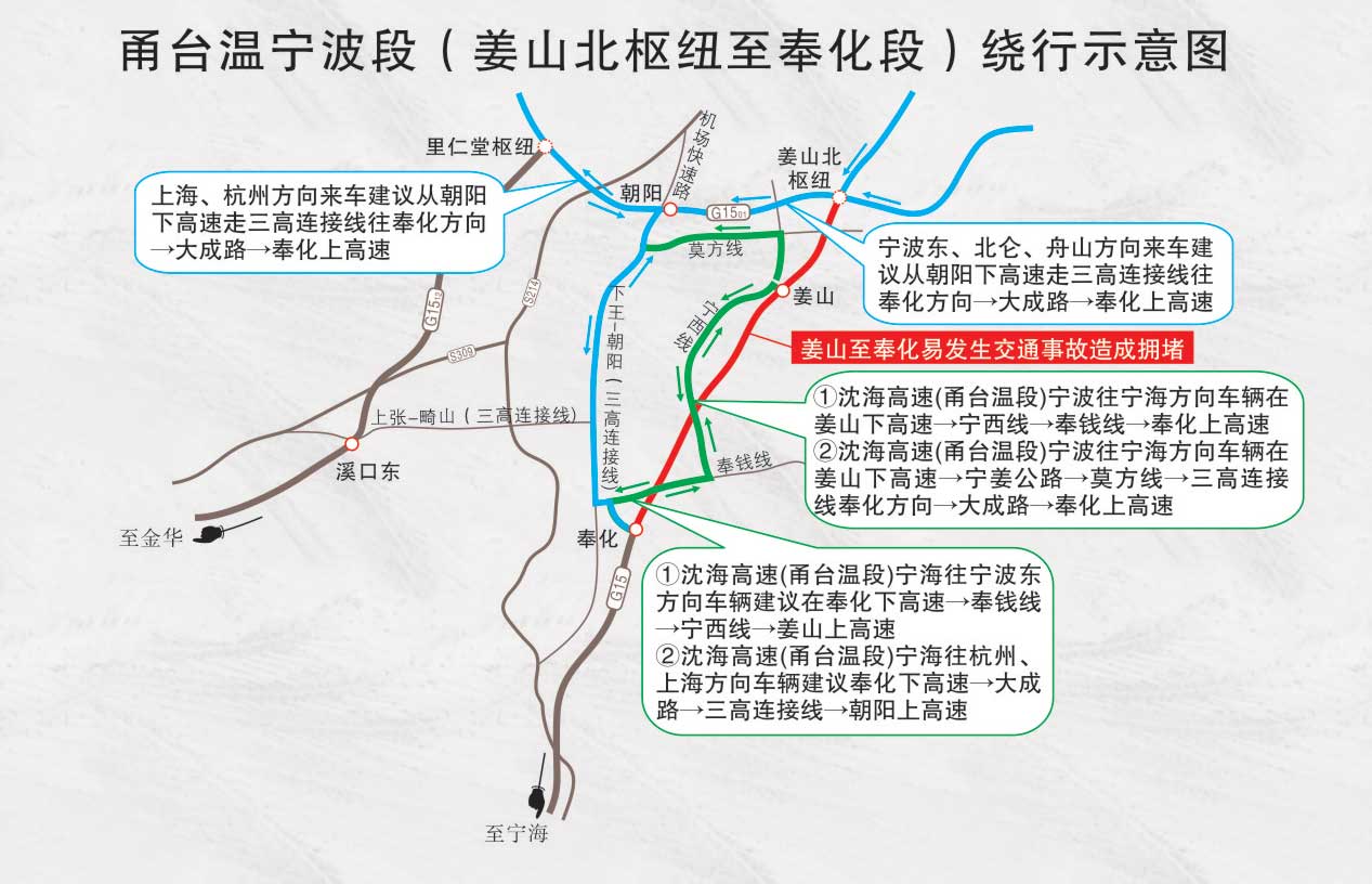 甬臺(tái)溫寧波段(姜山北樞紐至奉化段)姜山至奉化易發(fā)生意外造成擁堵。如發(fā)生擁堵,沈海高速(甬臺(tái)溫段)寧波往寧海方向車輛在姜山下高速→寧西線→奉錢線→奉化上高速或在姜山下高速→寧姜公路→莫方線→三高連接線奉化方向→大成路→奉化上高速。