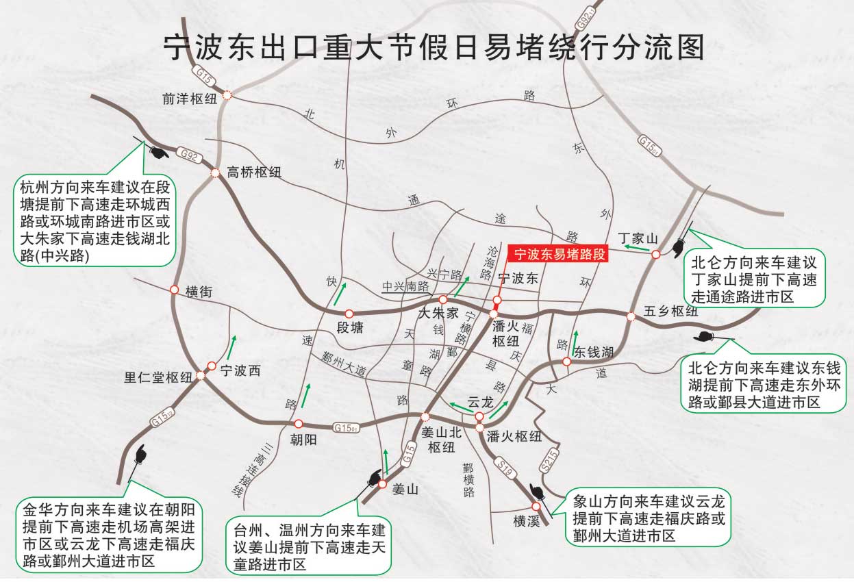 春節(jié)期間,寧波東出口如發(fā)生杭州方向來車建議在段塘提前下高速走環(huán)城西路或環(huán)城南路進(jìn)市區(qū)或大朱家下高速走錢湖北路(中興路);金華方向來車建議在朝陽提前下高速走機(jī)場(chǎng)高架進(jìn)市區(qū)或云龍下高速走福慶路或鄞州大道進(jìn)市區(qū);臺(tái)州、溫州方向來車建議姜山提前下高速走天童路進(jìn)市區(qū);象山方向來車建議云龍?zhí)崆跋赂咚僮吒c路或鄞州大道進(jìn)市區(qū);北侖方向來車建議東錢湖提前下高速走東外環(huán)路或鄞縣大道進(jìn)市區(qū);北侖方向來車建議丁家山提前下高速走通途路進(jìn)市區(qū)。