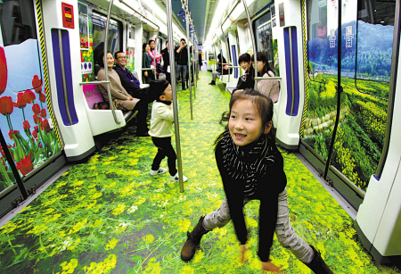 東錢湖旅游專列正式在寧波軌道交通1號線上線運營,乘客在專列車廂內(nèi)就可以領(lǐng)略東錢湖多姿多彩的風(fēng)景。昨天,一批市民代表提前參觀,大家看到綠油油的茶田、燦爛開放的郁金香、金黃的油菜花等充滿春天元素的車廂布景,紛紛感嘆:“這簡直是一輛開往春天的地鐵!”