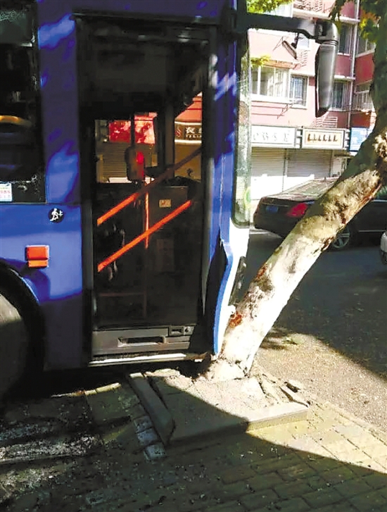 昨天下午兩點,記者來到事發(fā)現(xiàn)場,事發(fā)的公交車已經(jīng)被拖走,雖然經(jīng)過了清掃,但是地上還有零星的碎玻璃。被撞的行道樹有碗口粗細,已經(jīng)被撞歪了,樹皮也掉了一大塊。