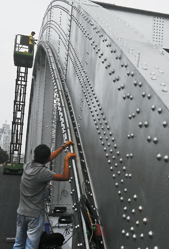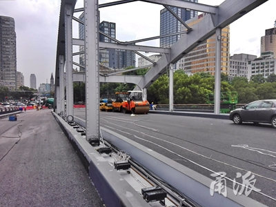 同時,還進行了12根橫梁和吊桿的對接鉚接,110余根縱梁的鉚接,上萬套高強螺栓的栓接,以及橋面板約300多米焊接等安裝工作,并于6月下旬進入橋面瀝青的鋪設(shè)階段。