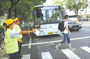 8時(shí),斑馬線上車流不息。幾位形象大使穿著“文明出行”志愿背心,開始上路開展勸導(dǎo)活動(dòng)。