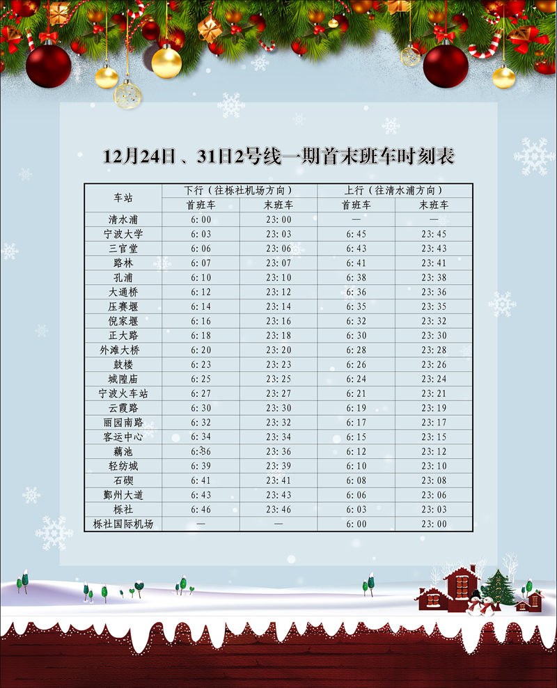 今天(12月21日)寧波市軌道交通集團(tuán)有限公司運(yùn)營(yíng)分公司發(fā)布了一則貼心的通告:12月24日、12月31日這兩天,寧波地鐵全線執(zhí)行特殊日時(shí)刻表,末班車延長(zhǎng)至23點(diǎn)。