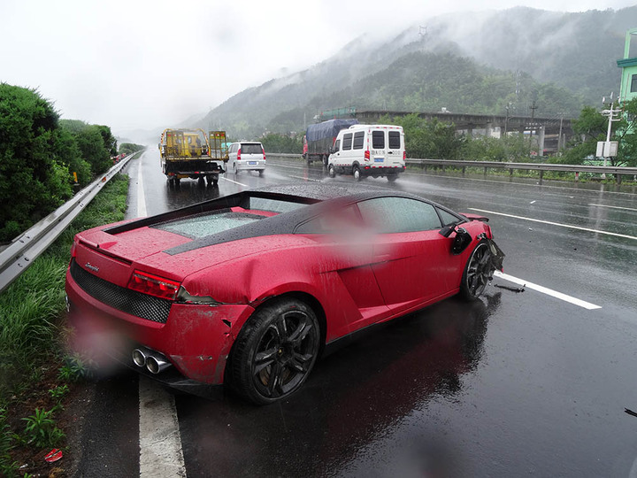 6月13日中午11點30分左右,周師傅駕駛價值400多萬元的紅色蘭博基尼超級跑車由杭州上高速去寧波,途經(jīng)280k處時,由于雨量較大,加上車速過快,蘭博基尼輪胎打滑,徑直撞上了集卡車的左前輪,在高速上轉(zhuǎn)了好幾個圈之后才停下,損毀嚴重。