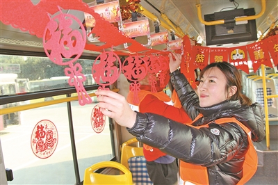 公交志愿者在裝扮車廂。(董美巧張燕攝)