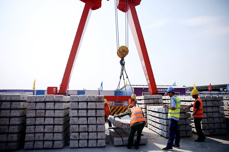 下午,記者看到作業(yè)人員將鋼軌、軌枕、扣件拼裝成軌排,再用龍門(mén)吊將拼裝好的軌排吊至軌道車(chē)上。所有施工流程一氣呵成,井井有條。