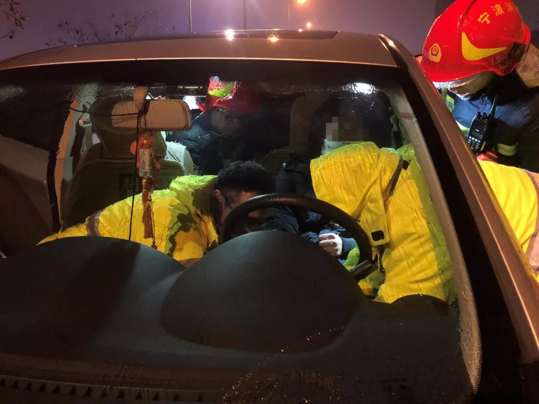 消防員到達現(xiàn)場后發(fā)現(xiàn),有兩輛車的車頭受損嚴重,其中一輛車上有一名被困人員。