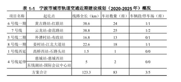 根據(jù)《公示》下面的附件《寧波市城市軌道交通近期建設(shè)規(guī)劃(2020-2025)環(huán)境影響報(bào)告書(征求意見稿)》,寧波軌道交通將從明年開始進(jìn)入第三輪建設(shè)周期,到2025年底前還將建設(shè)包括6號(hào)線一期、7號(hào)線、5號(hào)線二期、8號(hào)線一期、1號(hào)線西延、4號(hào)線延伸工程等在內(nèi)的6條線路。