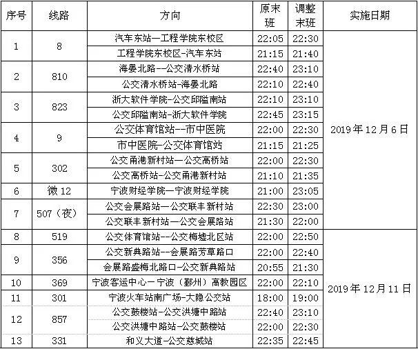 今天起,市公交302路等7條線路實(shí)施延時收班,開啟寧波公交夜間服務(wù)再升級工程。此外,12月11日,市公交還將對519路等6條線路實(shí)施延時。