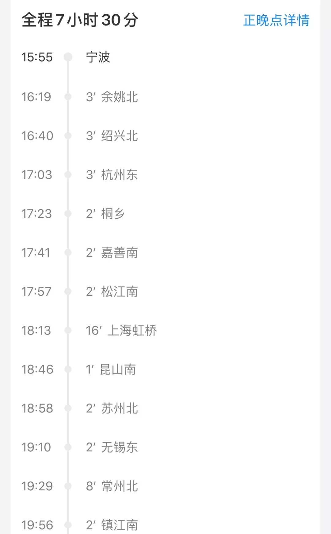 根據(jù)時刻,新開通的G7792次,下午3點55分從寧波站出發(fā),經(jīng)過徐州東后,上徐宿淮鹽鐵路,晚上10點40分到達睢寧站,10點54分到達宿遷站,11點25分到達淮安東站,全程7小時30分鐘,二等座票價482.5元。