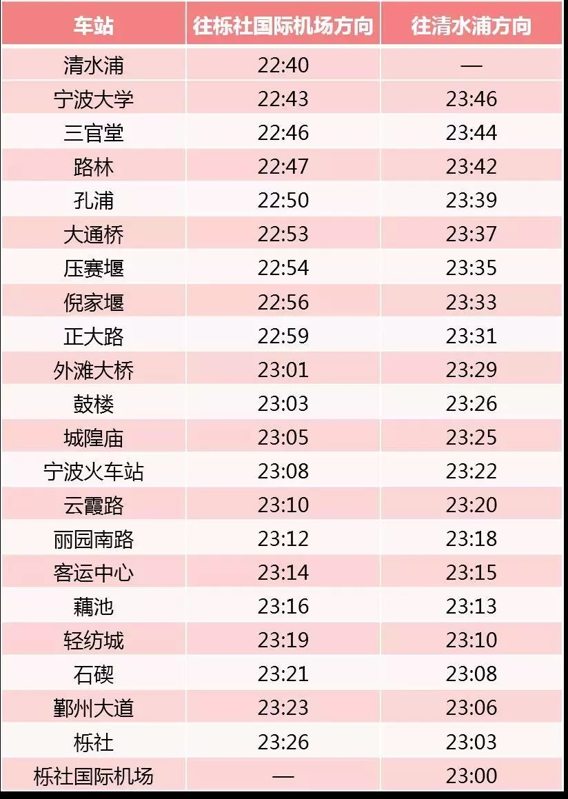 軌道交通在31日當(dāng)天,1號線高橋西往霞浦方向,末班車時間為23:13,霞浦往高橋西方向,末班車時間為22:40;2號線一期櫟社國際機(jī)場往清水浦方向,末班車時間為23:00,清水浦往櫟社國際機(jī)場方向,末班車時間為22:40;3號線一期,兩個始發(fā)站末班車時間均為23:00;寧奉線首通段末班車時間不變。