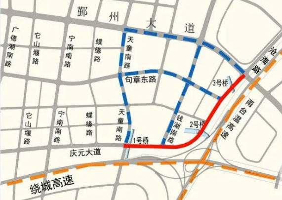 沿線相交道路主要有天童南路、錢湖南路、句章東路及鄞州大道。新建跨河橋梁3座,實行排水管道雨污分流。