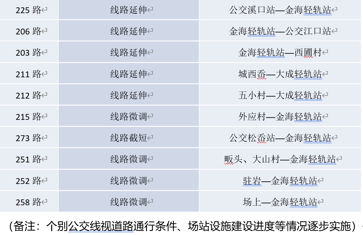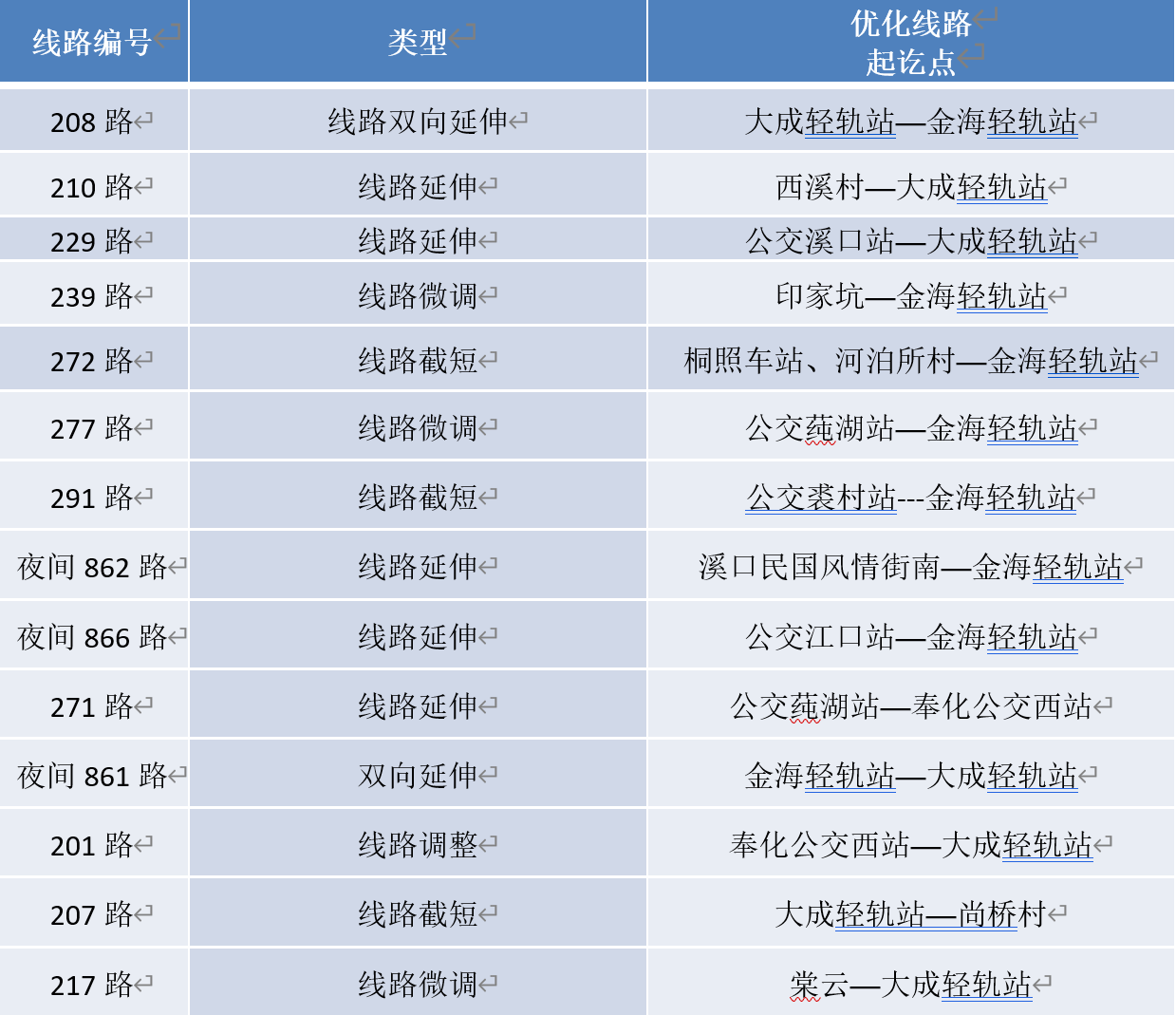 2020年有24條常規(guī)公交線路將進行優(yōu)化,包括線路延伸、截短及局部改道等,具體調(diào)整后如下表: