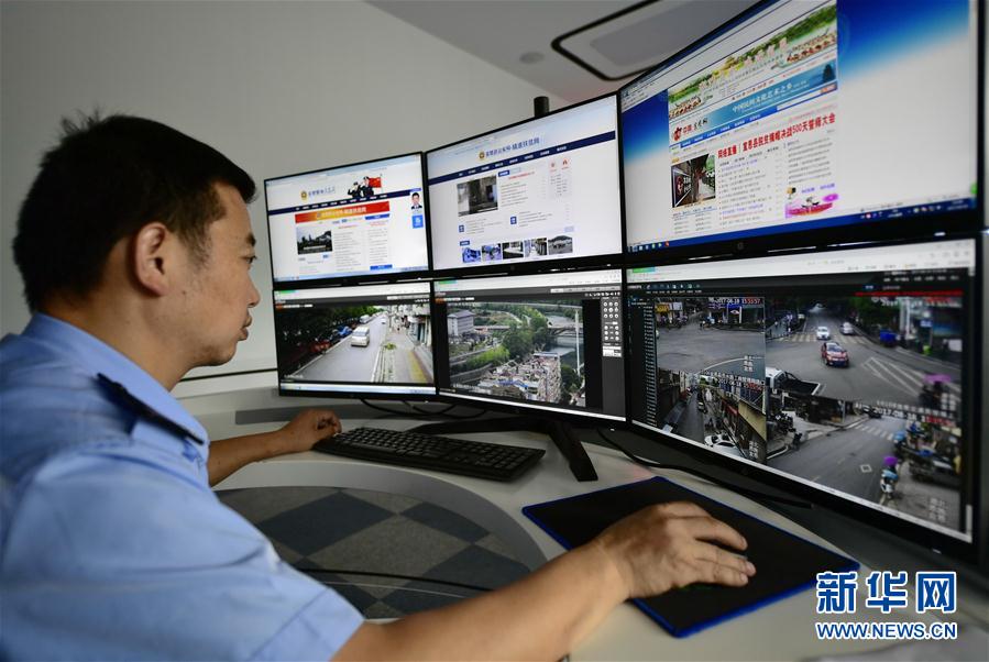 資料圖:民警在查看道路公共視頻。圖片來(lái)源于新華網(wǎng)