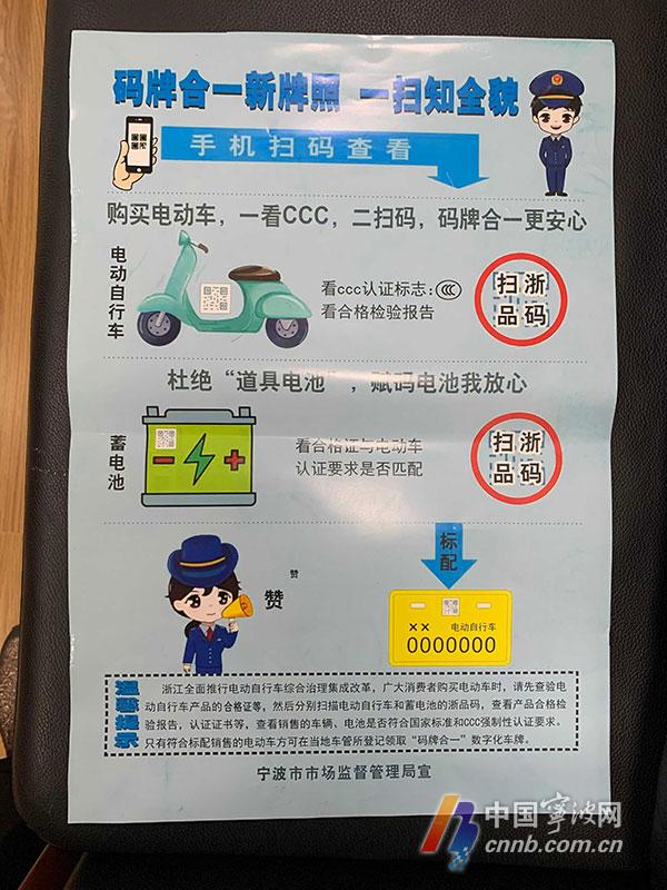 今天上午,記者在海曙區(qū)石碶洪昌電瓶車經(jīng)營(yíng)部看到,在售電動(dòng)自行車和蓄電池上都已賦上了“浙品碼”,掃描電動(dòng)自行車上二維碼后即可獲取車輛圖片、產(chǎn)品合格證明等基本信息及對(duì)應(yīng)的蓄電池類型、品牌、型號(hào)等信息,掃描蓄電池上二維碼后即可獲取對(duì)應(yīng)生產(chǎn)企業(yè)、品牌、型號(hào)等信息,確保車、池符合強(qiáng)制性產(chǎn)品認(rèn)證一致性要求,杜絕銷售過程中可能出現(xiàn)的“道具電池”、非法改裝等現(xiàn)象。