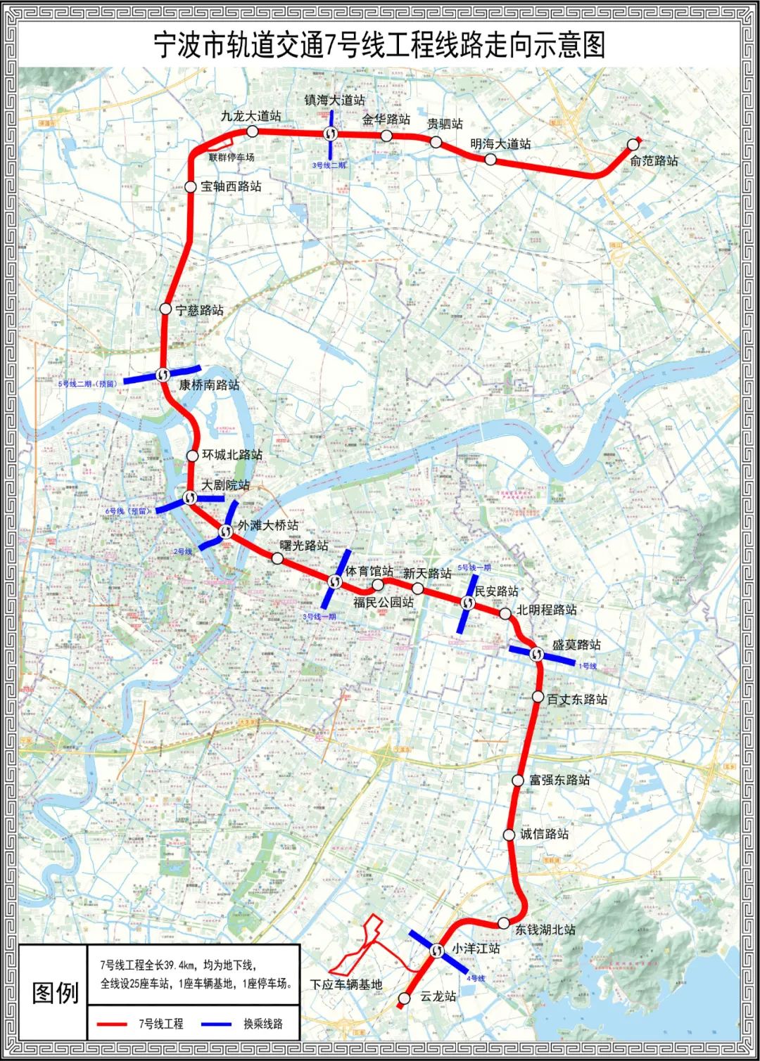 7號線線路南起東錢湖地區(qū),穿越邱隘鎮(zhèn)、東部新城、老外灘、灣頭、莊橋、鎮(zhèn)海新城,最終到達(dá)俞范組團(tuán),線路依次經(jīng)過鄞州區(qū)、江北區(qū)和鎮(zhèn)海區(qū)。線路全長約39.4km,全部為地下線,設(shè)站25座。