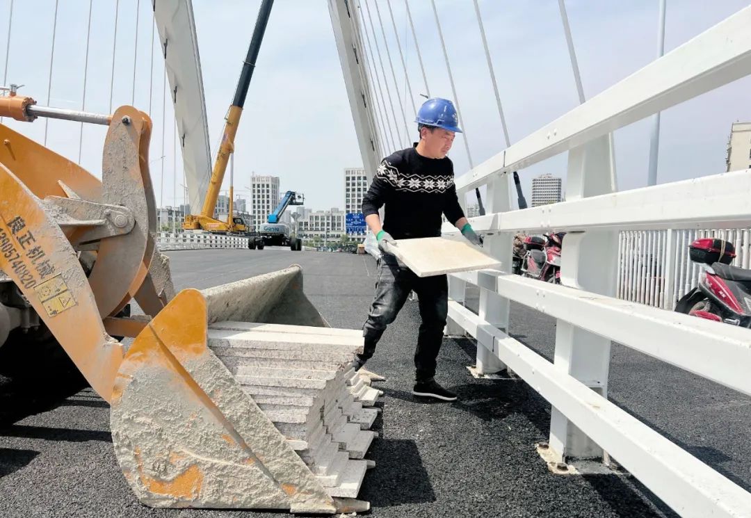 大橋兩側(cè)的人行道正在鋪裝;護(hù)欄在打磨后,進(jìn)行著最后的焊接;兩臺(tái)曲臂高空作業(yè)車護(hù)送工人抵達(dá)大橋上空,進(jìn)行燈光調(diào)試……4月3日上午,橫跨奉化江面的新典橋項(xiàng)目正在進(jìn)行收尾工作,有望于4月底通車。