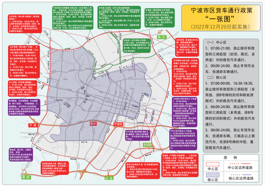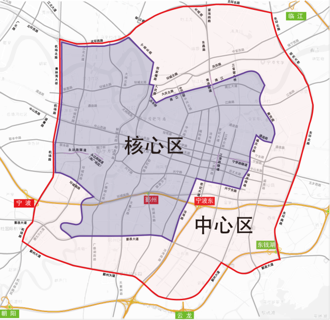核心區(qū)指逆時針由甬江-慶豐橋-人民路-環(huán)城北路-倪家堰路-寧慈東路-北環(huán)西路-機(jī)場北路-機(jī)場路-環(huán)城南路-奉化江-鄞縣大道-滄海路-興寧路-興寧東路-福慶南路-福慶北路-通途路-聚賢路為邊界圍成的封閉區(qū)域內(nèi)道路(不含區(qū)域內(nèi)的高速公路)。