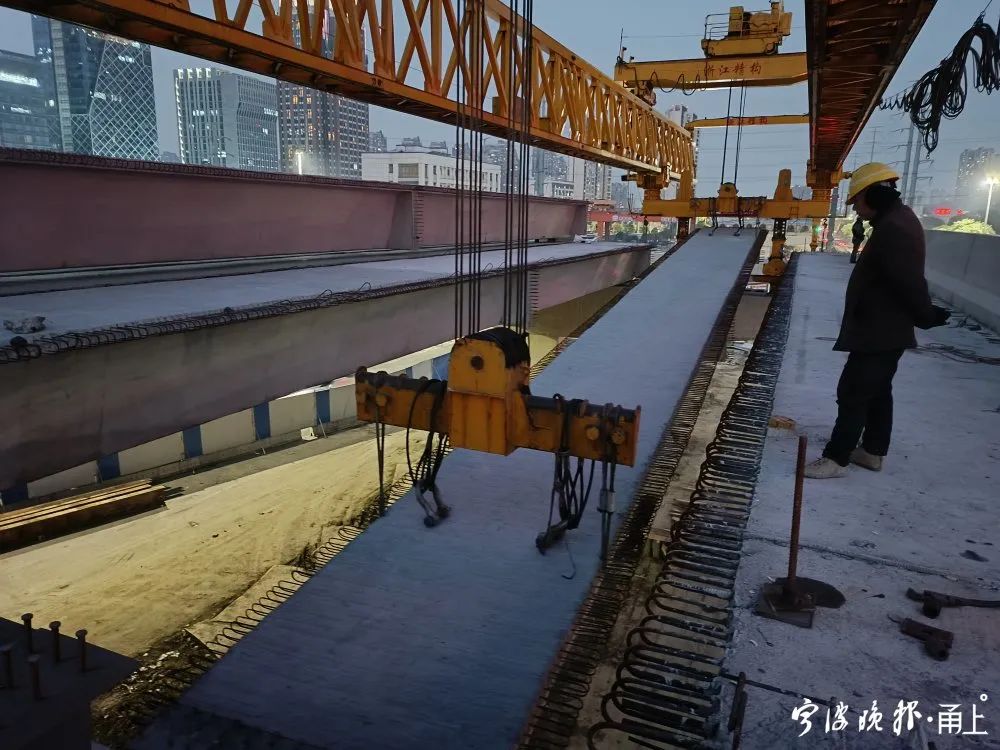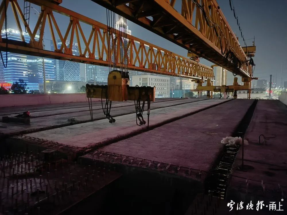 “它山堰路至天童南路段全長1070米,共計(jì)279片小箱梁、37片鋼箱梁。因項(xiàng)目地處南部商務(wù)區(qū),梁板架設(shè)過程中面臨了沿線交通量大、道口情況復(fù)雜、邊通車邊施工等諸多挑戰(zhàn),我們通過采取實(shí)時(shí)管控、分流引導(dǎo)和時(shí)段調(diào)整等舉措,確保箱梁架設(shè)的安全性。經(jīng)過連續(xù)兩晚的徹夜搶工,終于順利完成了高架結(jié)構(gòu)的架設(shè)。”鄞州大道快速路工程鄞州段建設(shè)單位項(xiàng)目負(fù)責(zé)人介紹。