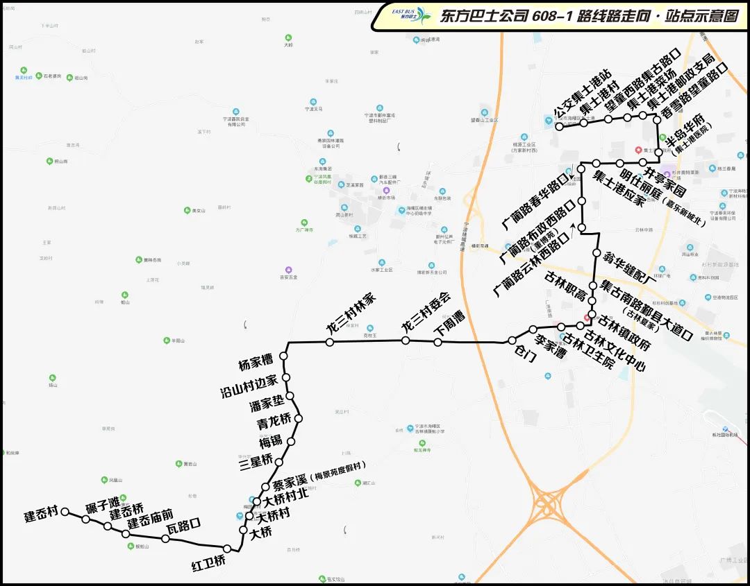 三、公交集士港站至公交烏頭門站的608路部分班次調(diào)整為公交集士港站至建岙村運(yùn)營,并編碼為608-1路