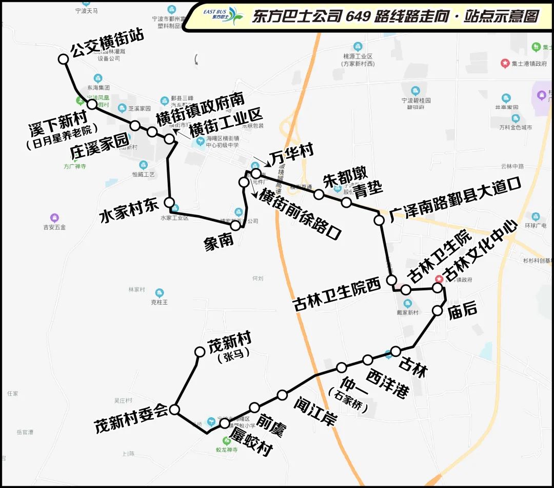 (四)調(diào)整后站點(diǎn)設(shè)置:公交橫街站、溪下新村(日月星養(yǎng)老院)、莊溪家園、橫街鎮(zhèn)政府南、橫街工業(yè)區(qū)↑、水家村東、象南村、萬華村↓、橫街前徐路口↑、朱都墩、青墊、廣澤南路鄞縣大道口、古林衛(wèi)生院西、古林衛(wèi)生院、古林文化中心、廟后、古林、西洋港、仲一(石家橋)、聞江岸、前虞、蜃蛟村、茂新村委會(huì)、茂新村(張馬);