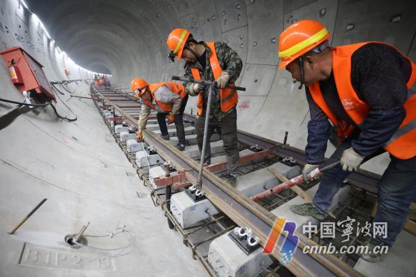 沉重的軌枕被吊入軌道,測(cè)量、捆扎……在寧波軌道交通3號(hào)線二期興海南路站約1000平方米的鋪軌基地,汽車(chē)吊不停卸貨、吊裝,工人們忙著安裝、澆筑,一派熱火朝天景象。
