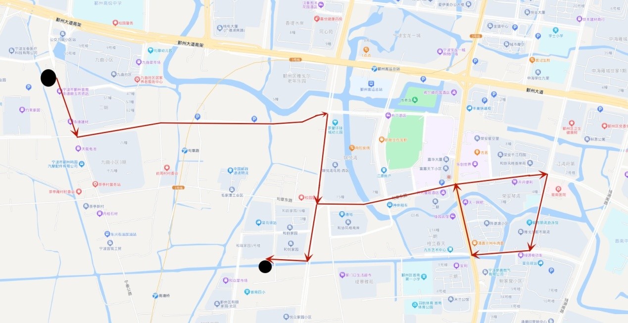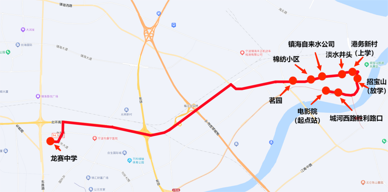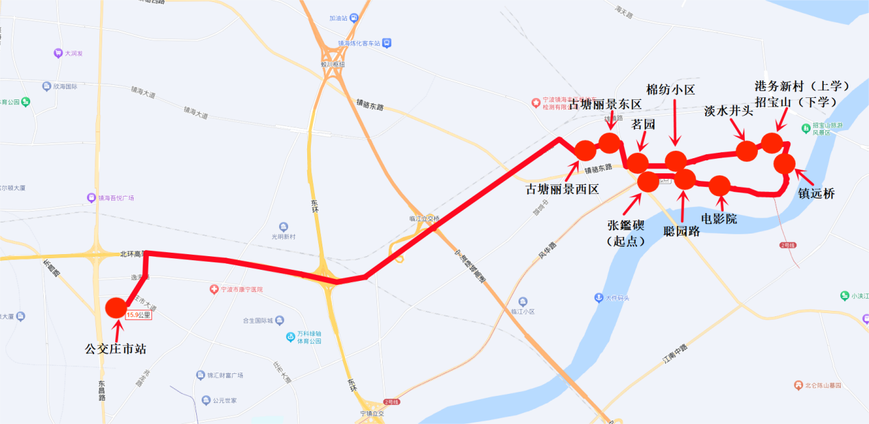 站點(diǎn)設(shè)置:公元世家、莊市街道行政服務(wù)中心、漢塘路逸夫路口、招呼站(鎮(zhèn)海區(qū)實(shí)驗(yàn)小學(xué)南門)