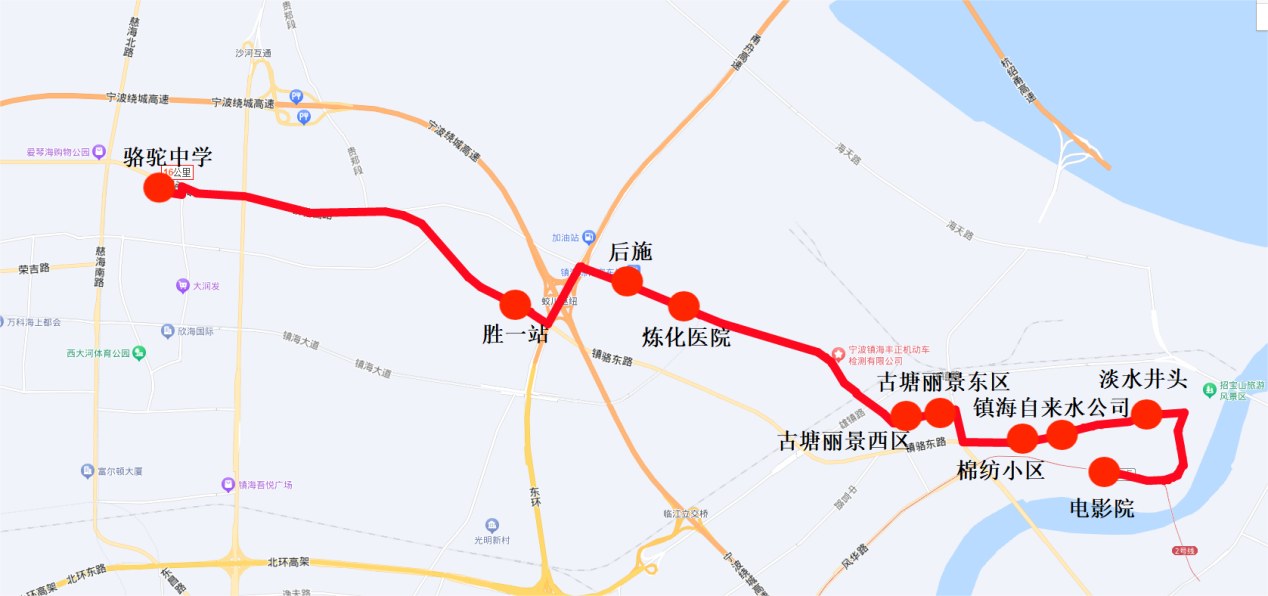 站點(diǎn)設(shè)置:電影院、淡水井頭、鎮(zhèn)海自來水公司、棉紡小區(qū)、茗園、古塘麗景東區(qū)、古塘麗景西區(qū)、煉化醫(yī)院、后施、勝一村、駱駝中學(xué)