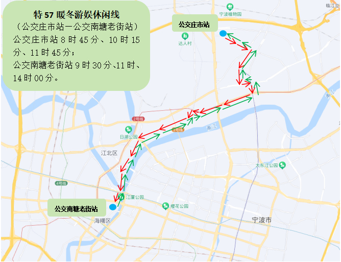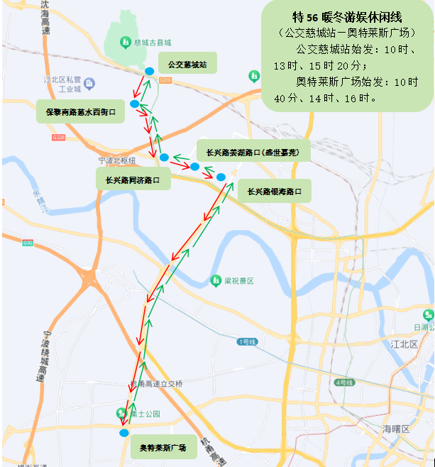 站點設(shè)置:公交慈城站、保黎南路慈水西街口、長興路同濟路口、長興路姜湖路口(盛世嘉苑)、長興路銀海路口、杉井奧特萊斯廣場。