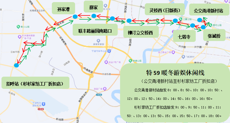 站點設(shè)置:公交甬港新村站、張斌橋(舟孟北路地鐵站)、七塔寺、靈橋西(日新街)、柳汀立交橋西、聯(lián)豐路麗園南路口(送子鳥醫(yī)院)、薛家、孫家漕、招呼站(杉杉家紡工廠折扣店)。