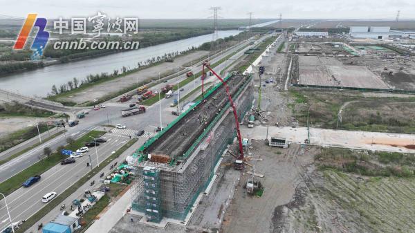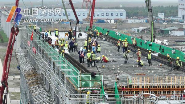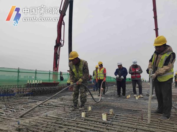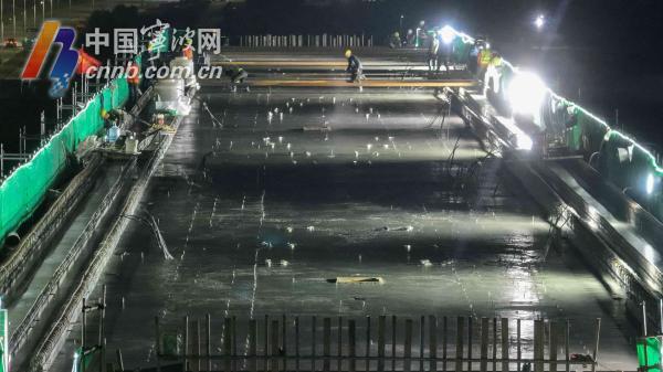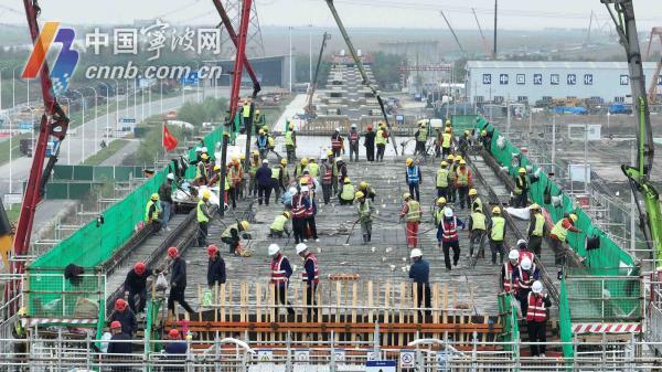 前晚8時18分,在前灣新區(qū)龍寶路東側(cè)施工現(xiàn)場,經(jīng)過20個小時連續(xù)奮戰(zhàn),通蘇嘉甬高鐵特大橋A段首聯(lián)連續(xù)梁完成澆筑,標志著橋梁上部結(jié)構施工正式拉開序幕,項目建設全面開啟加速度。