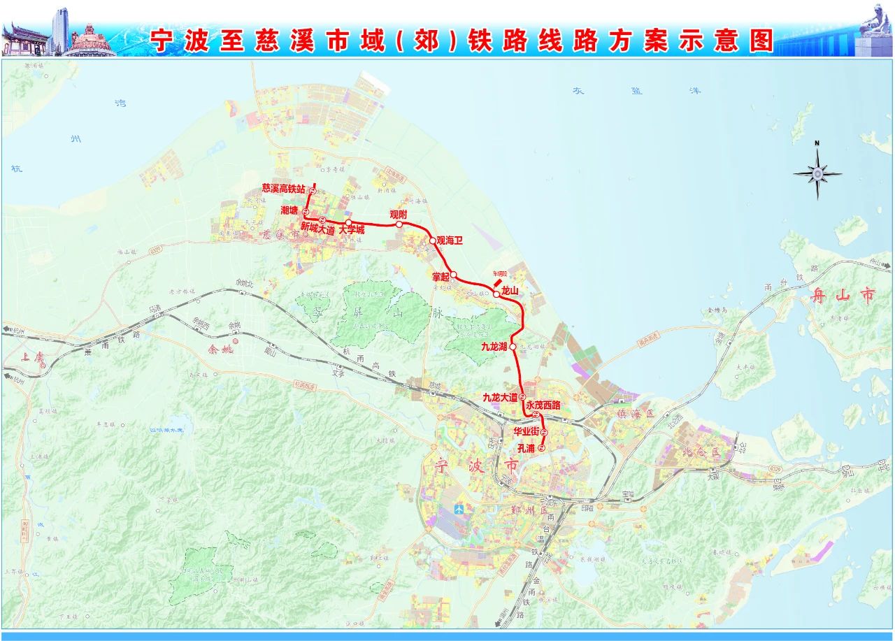 市域鐵路慈溪線起于江北孔浦站,與2號線孔浦站換乘,經江北城區(qū)、鎮(zhèn)海城區(qū)、九龍湖鎮(zhèn)、龍山、掌起、觀海衛(wèi)、慈溪城區(qū),終至慈溪高鐵站。線路全長約64公里,共設13座車站,3座隧道。